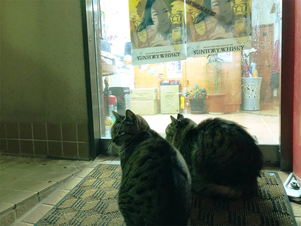 わたしは、小路を歩きました。提灯を見上げながら行くと十字路になっていて、右の道を選ぶとさらに道が先細り、二股道でこんどは左を選び、室外機がびっしり並んだビルの背中を見ながら細い石畳を行くと、ぽつんと明かりの漏れる店がありました。酒屋さんのようで、入り口のシャッターは半分閉じています。そこから漏れる明かりにすがるように猫が2匹座っていて、わたしの顔を見るとにゃんと鳴きました。しゃがみ込んでカメラを向けると、まるで検問でもするかのように尻尾をピンと立ててわたしの膝下までやってきて、熱心にふんふんと鼻を鳴らしてまた、酒屋さんの明かりの下に帰っていきました。